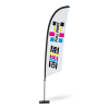 El Fly Banner Surf, es un Fly Banner con forma de tabla de surf que se ha vuelto en un reclamo de comunicación y publicidad muy popular en los últimos años. Una de sus principales ventajas es que dispone de más espacio en la bandera para el diseño del mensaje que se quiere comunicar. El pack completo esta preparado con todo lo necesario para su exposición, incluyendo mástil, bandera ya impresa con el diseño personalizado en diferentes tamaños, una base a elegir de entre las 8 disponibles y todos los accesorios necesarios para su montaje.